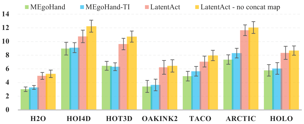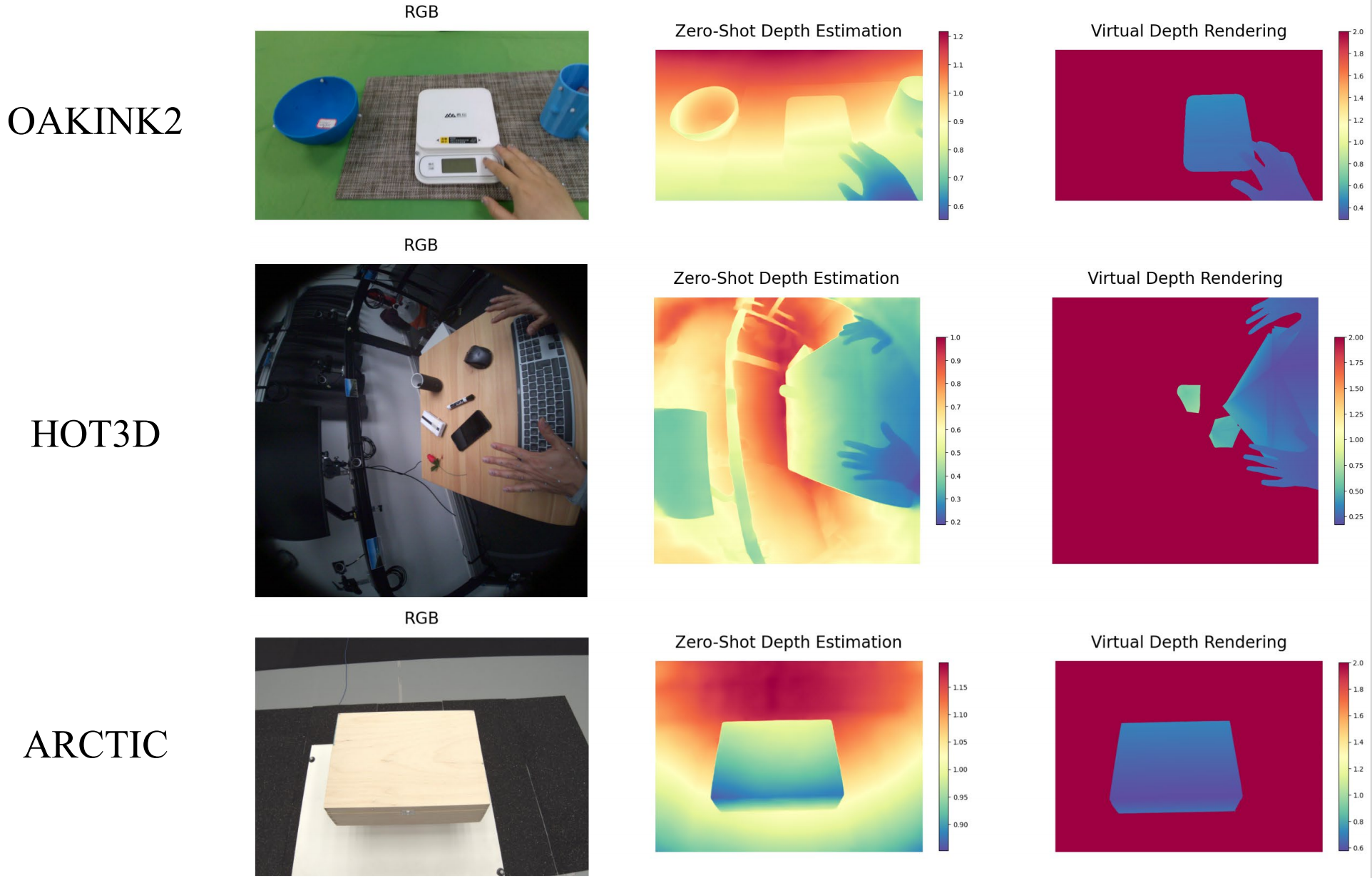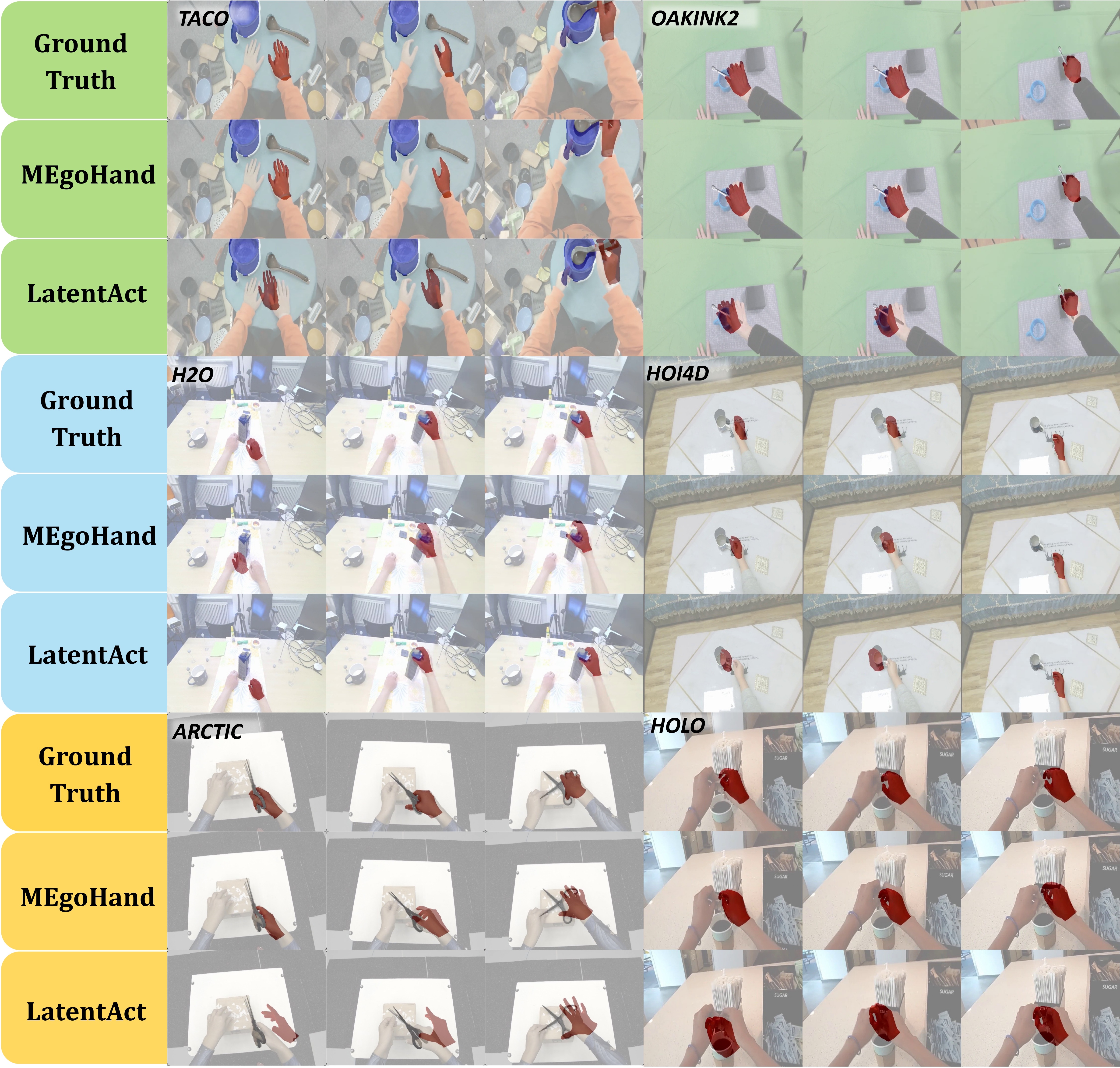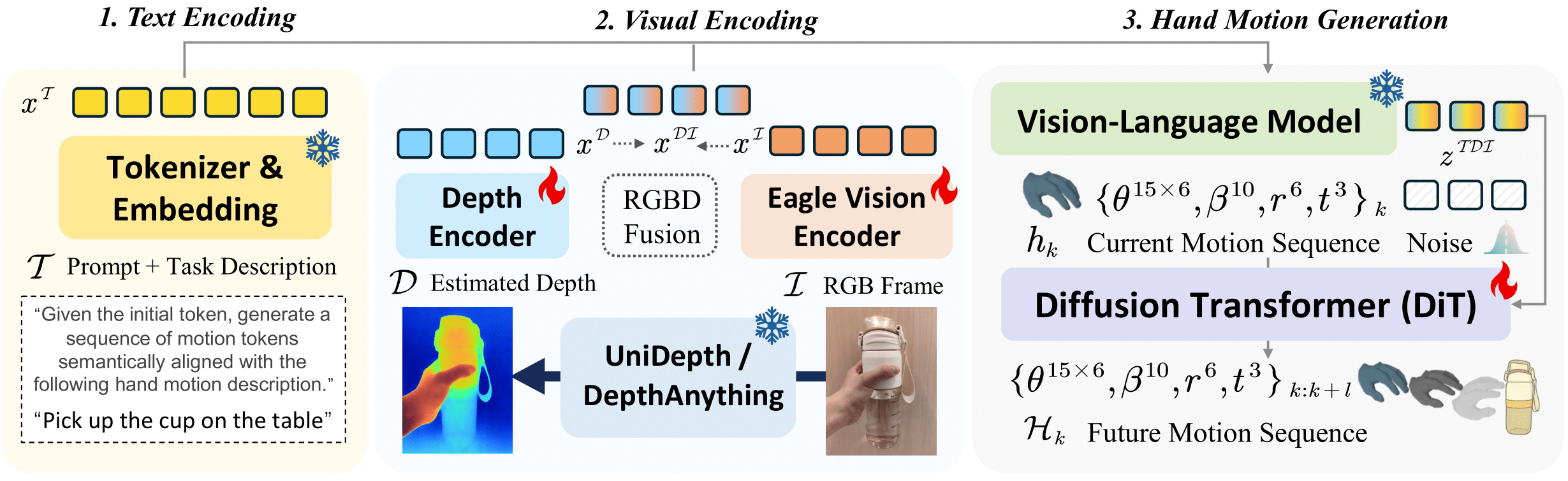 Egocentric hand-object motion generation is crucial for immersive AR/VR and robotic imitation but remains challenging due to unstable viewpoints, self-occlusions, perspective distortion, and noisy ego-motion. Existing methods rely on predefined 3D object priors, limiting generalization to novel objects, which restricts their generalizability to novel objects. Meanwhile, recent multimodal approaches suffer from ambiguous generation from abstract textual cues, intricate pipelines for modeling 3D hand-object correlation, and compounding errors in open-loop prediction. We propose MEgoHand, a multimodal model that synthesizes physically plausible hand-object interactions from egocentric RGB, text, and initial hand pose. MEgoHand introduces a bi-level architecture: a high-level “cerebrum” leverages a vision language model (VLM) to infer motion priors from visual-textual context and a monocular depth estimator for object-agnostic spatial reasoning, and a low-level DiT-based motion decoder generates fine-grained trajectories via flow-matching, along with temporal orthogonal filtering to enhance to enhance smoothness. To unify heterogeneous datasets, we design Inverse MANO Retargeting Network and Virtual RGB-D Renderer, curating a unified dataset of 3.35M RGB-D frames, 24K interactions, and 1.2K objects. Extensive experiments across 5 in-domain and 2 cross-domain datasets demonstrate the effectiveness of MEgoHand, achieving substantial reductions in wrist translation error (86.9%⬇) and joint rotation error (34.1%⬇), highlighting its capacity to accurately model fine-grained hand joint structures and generalize robustly across diverse scenarios.